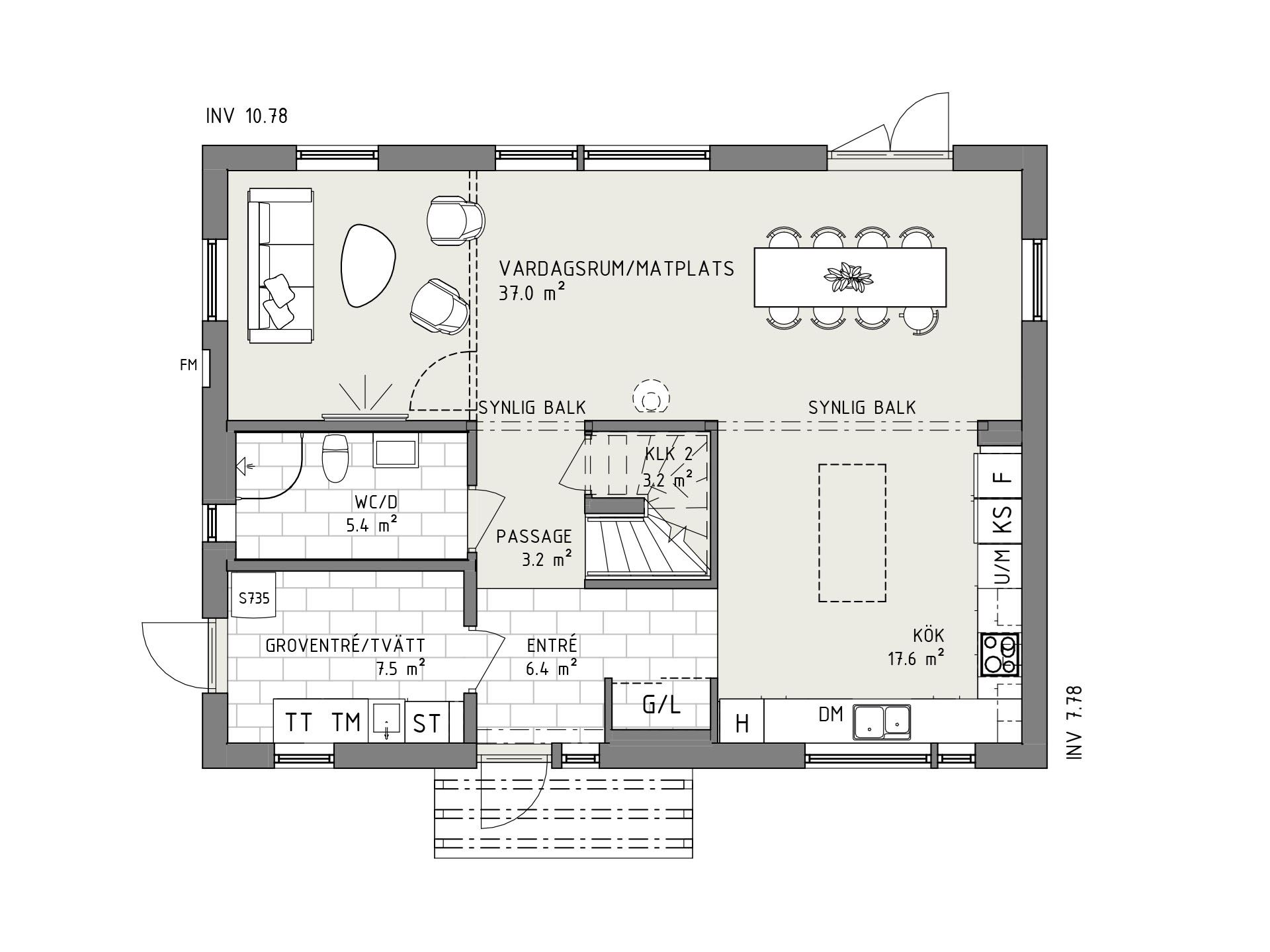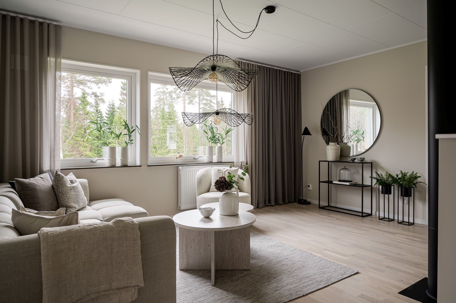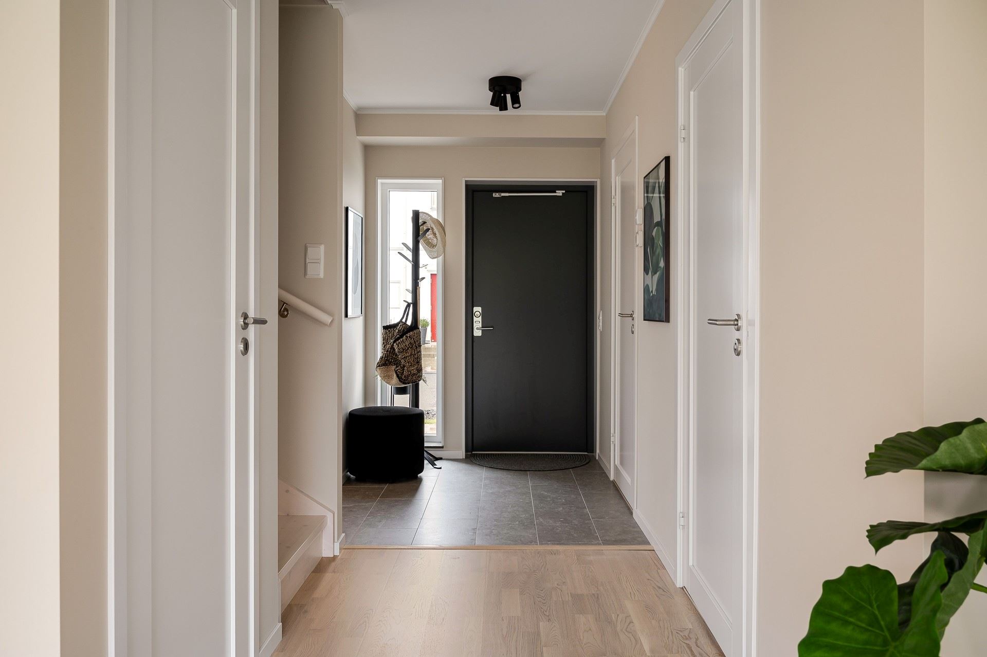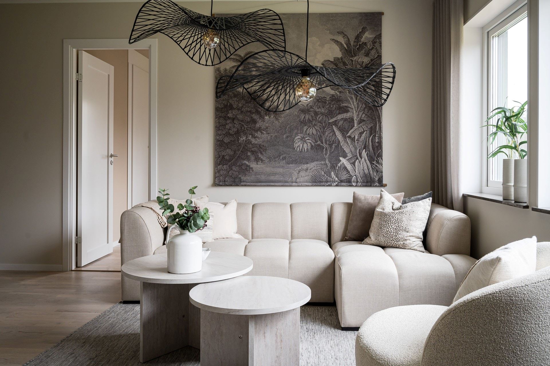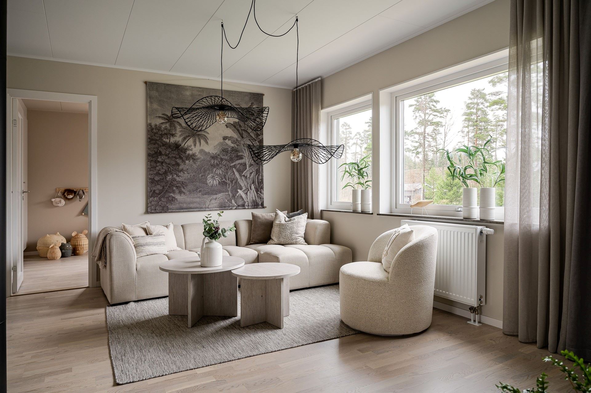 När du kliver in möts du av ett härligt ljus från vardagsrummets stora fönsterpartier. Den öppna planlösningen är social och genomtänkt, med den centrala trappan som skapar ett naturligt flöde mellan husets ytor.