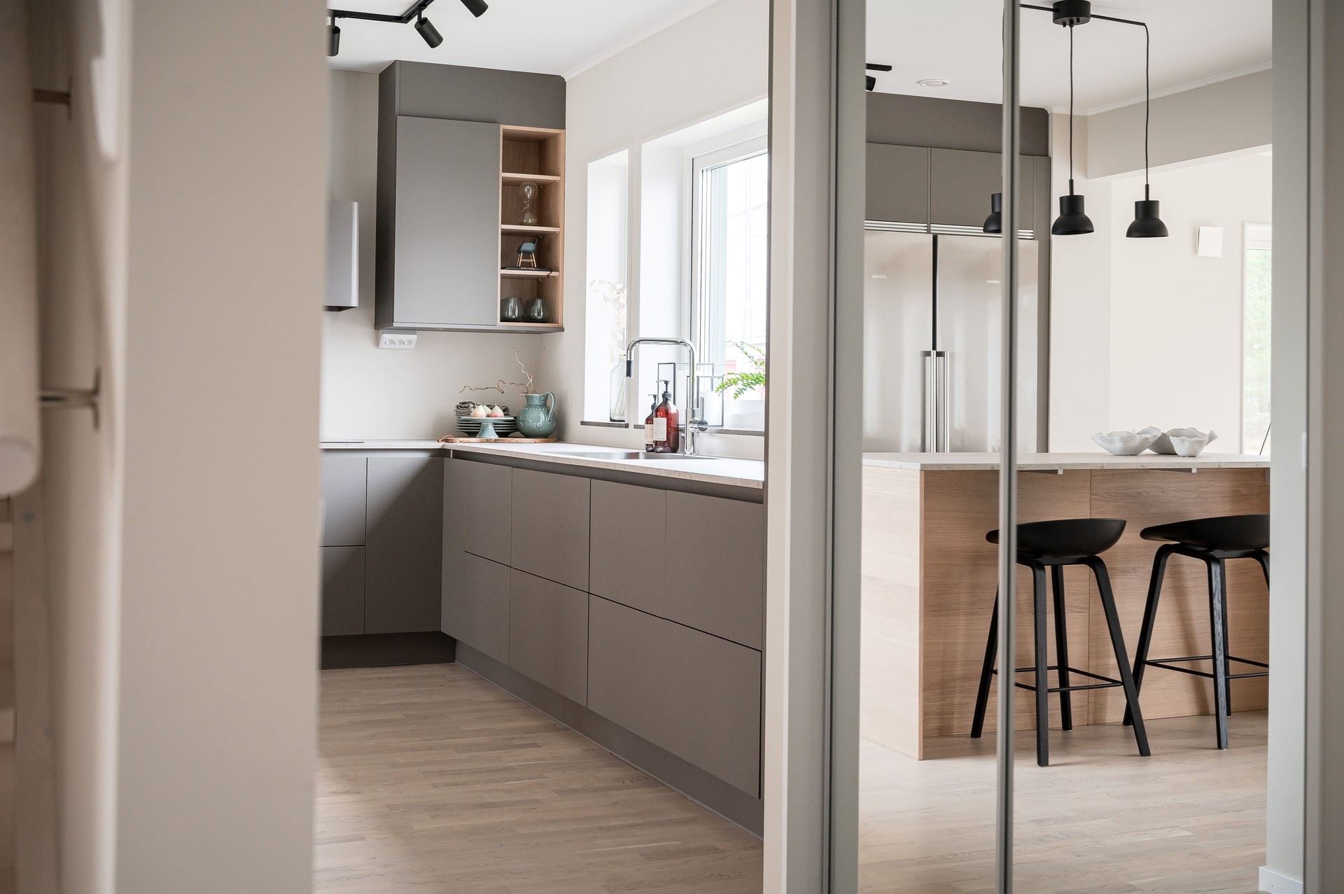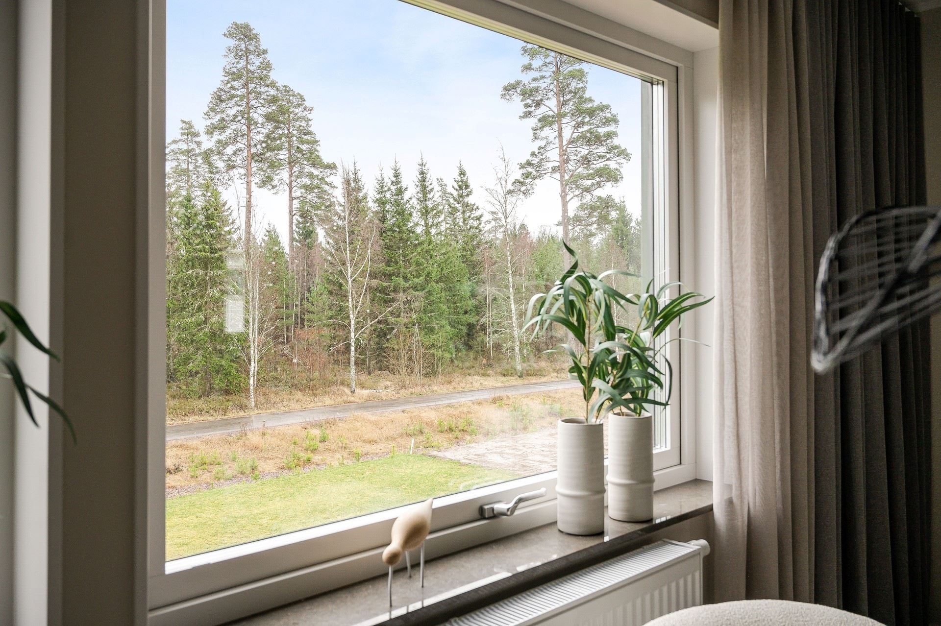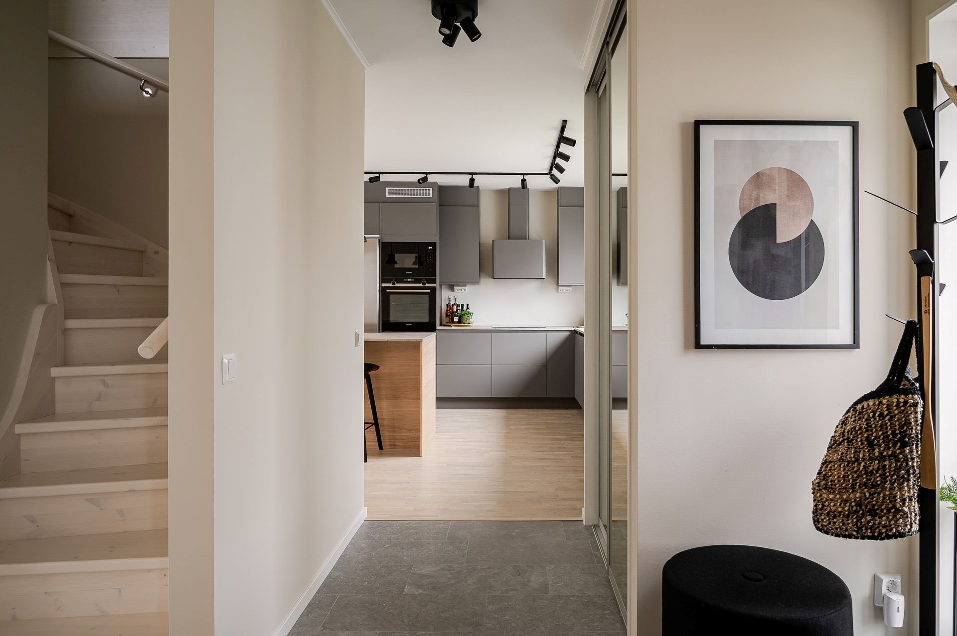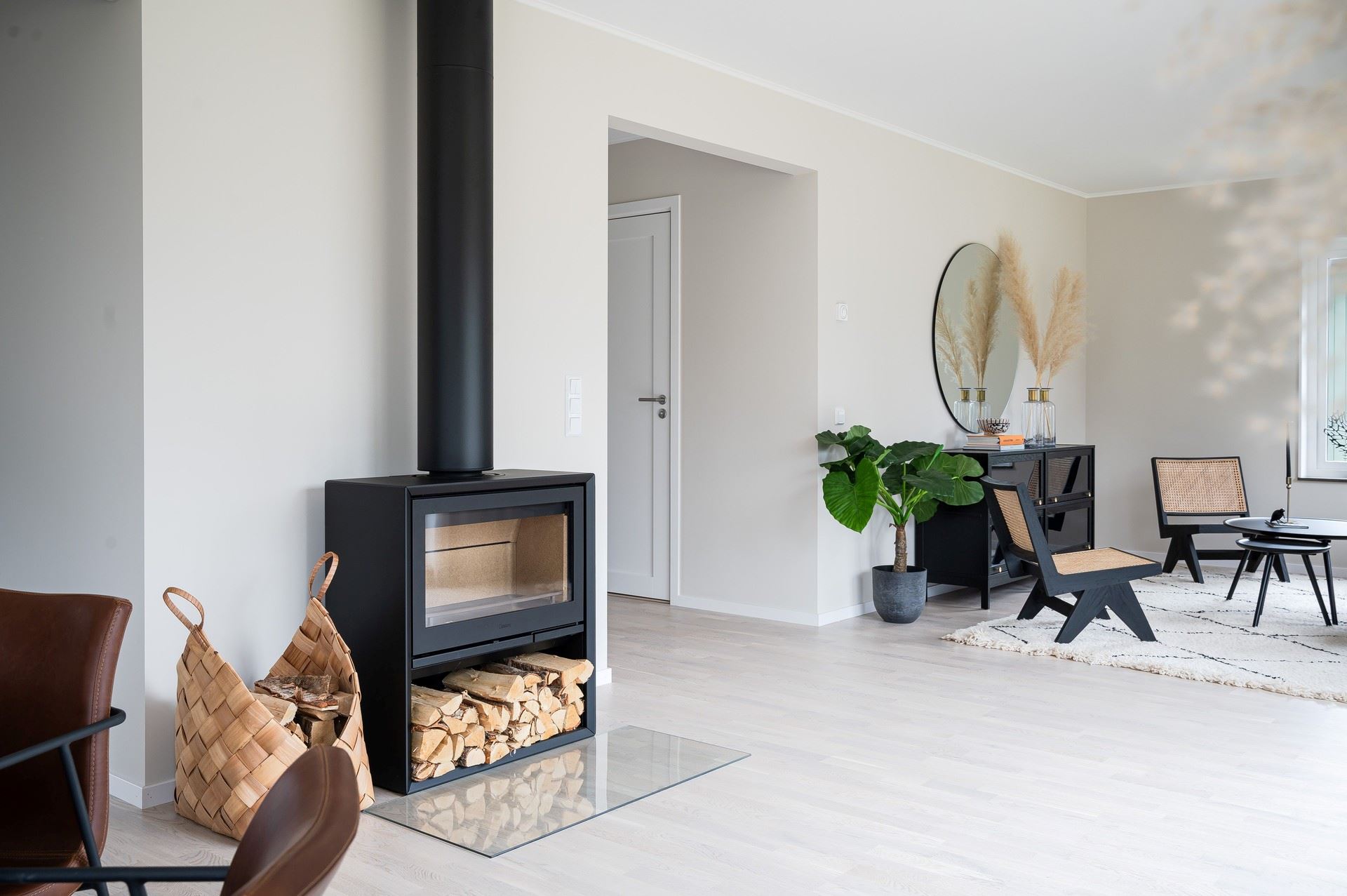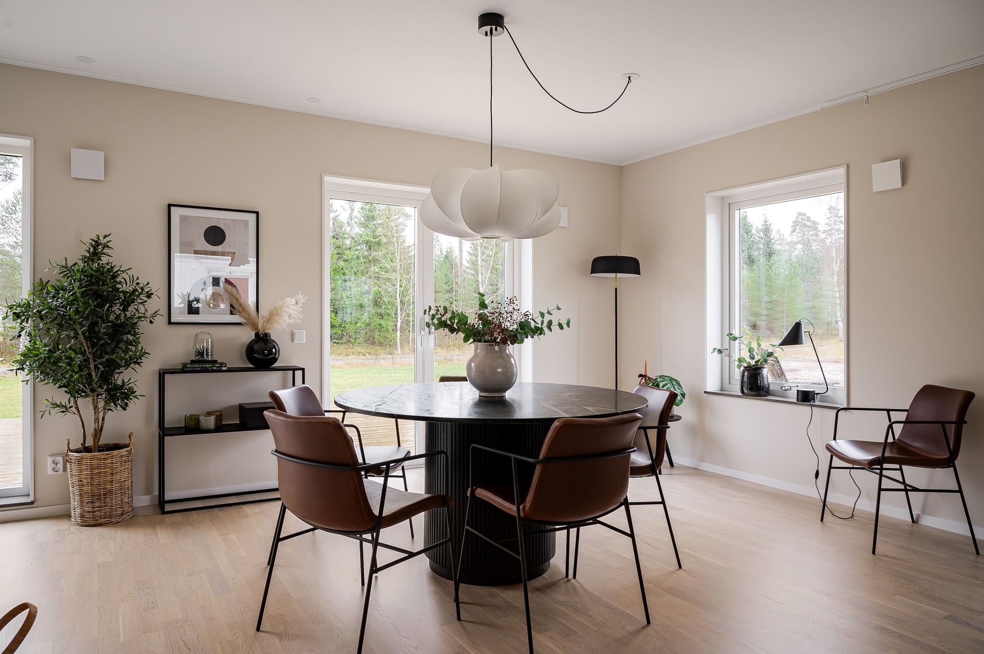När du kliver in möts du av ett härligt ljus från vardagsrummets stora fönsterpartier. Den öppna planlösningen är social och genomtänkt, med den centrala trappan som skapar ett naturligt flöde mellan husets ytor.