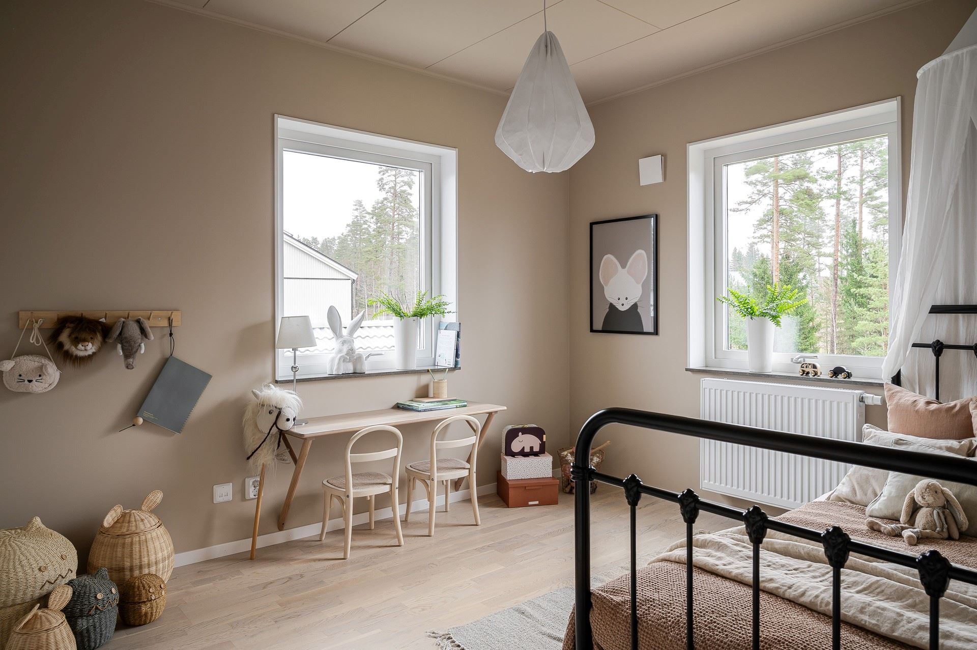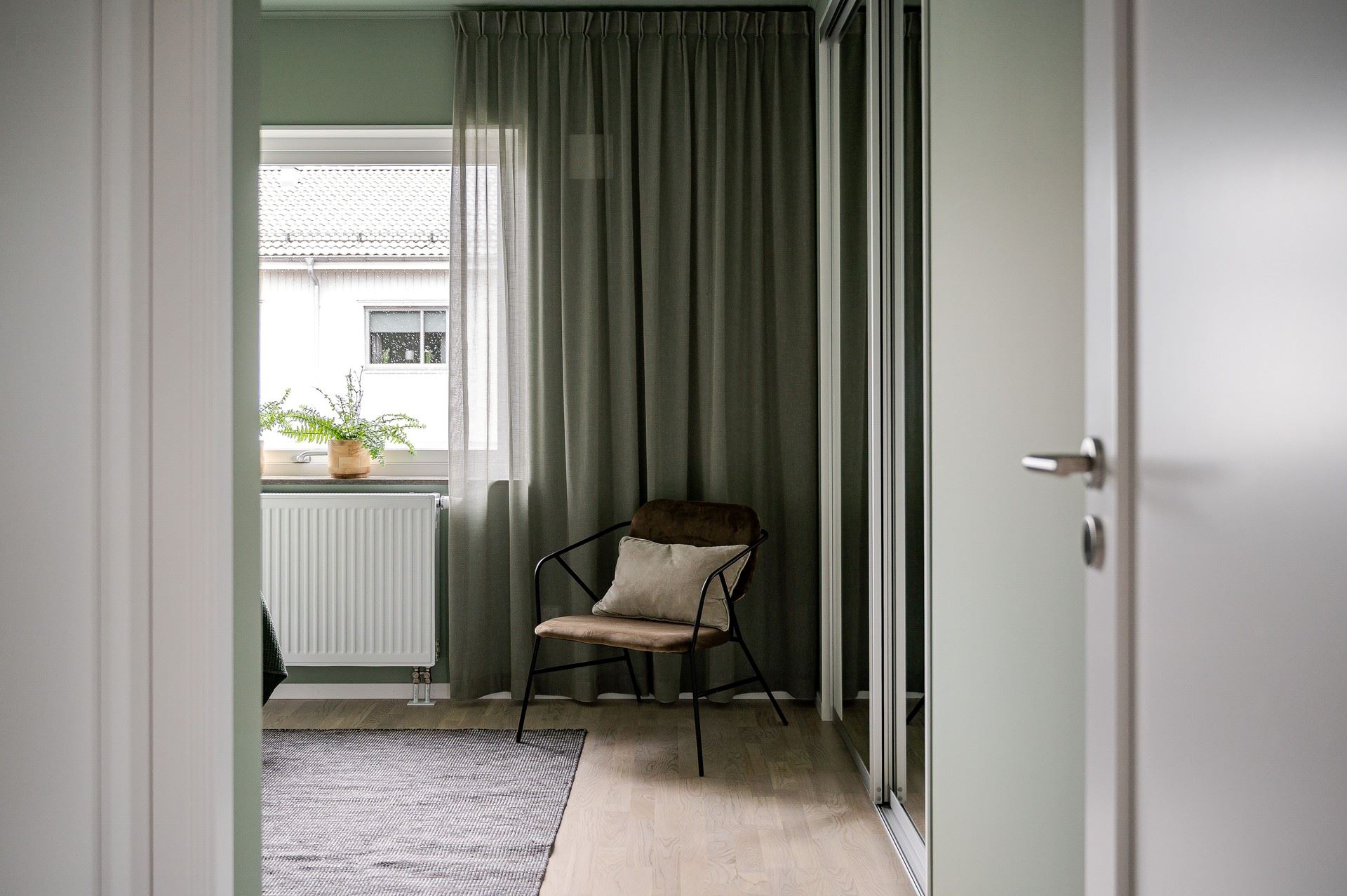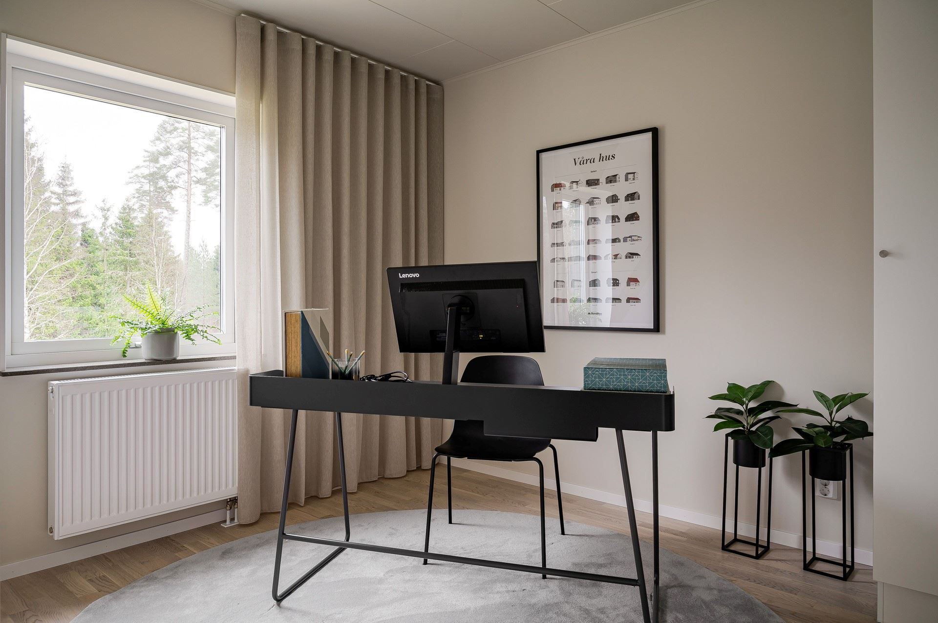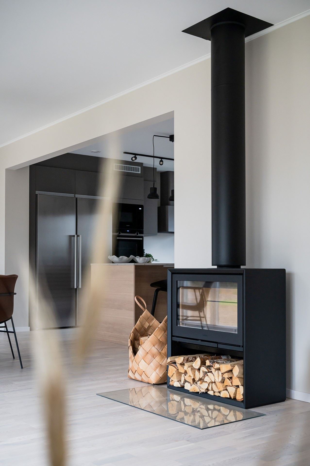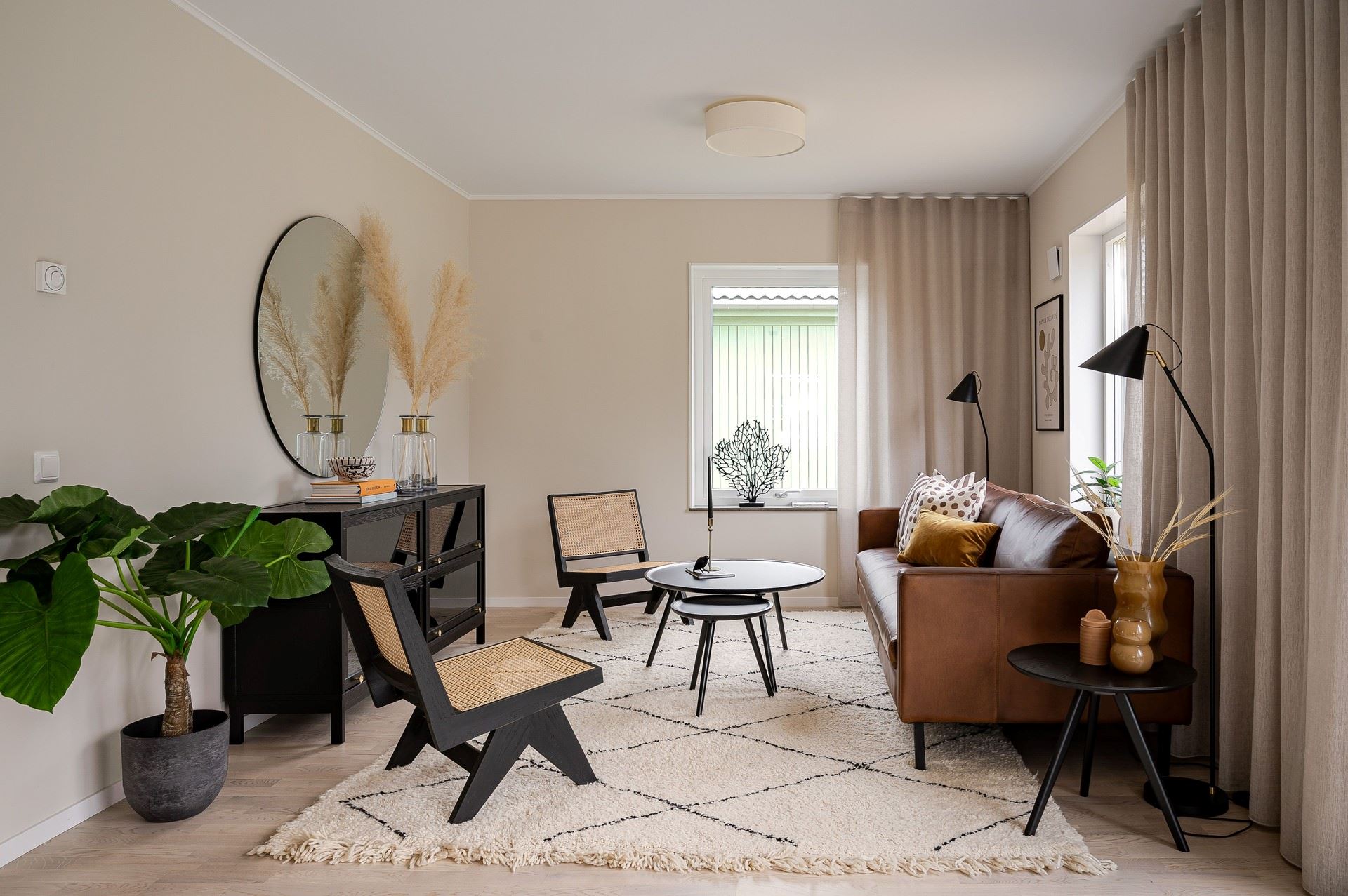 När du kliver in möts du av ett härligt ljus från vardagsrummets stora fönsterpartier. Den öppna planlösningen är social och genomtänkt, med den centrala trappan som skapar ett naturligt flöde mellan husets ytor.
