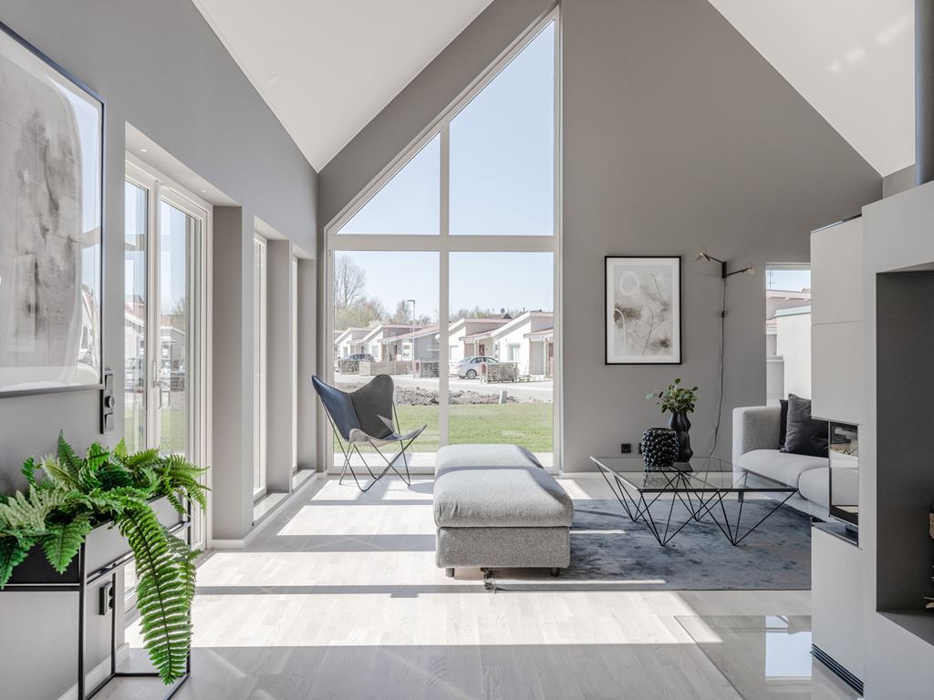 När du öppnar dörren möts du av ett ganska öppet entréplan, men allt flyter inte ihop. Matplatsen och köket separeras med en köksö och vardagsrummet bryter av med ett ryggåstak i vinkel. Huset är klassiskt, och har en kort takfot för att få det att kännas mer resligt samtidigt som fönsterplaceringen och fasaden gör sitt för en mer modern känsla.