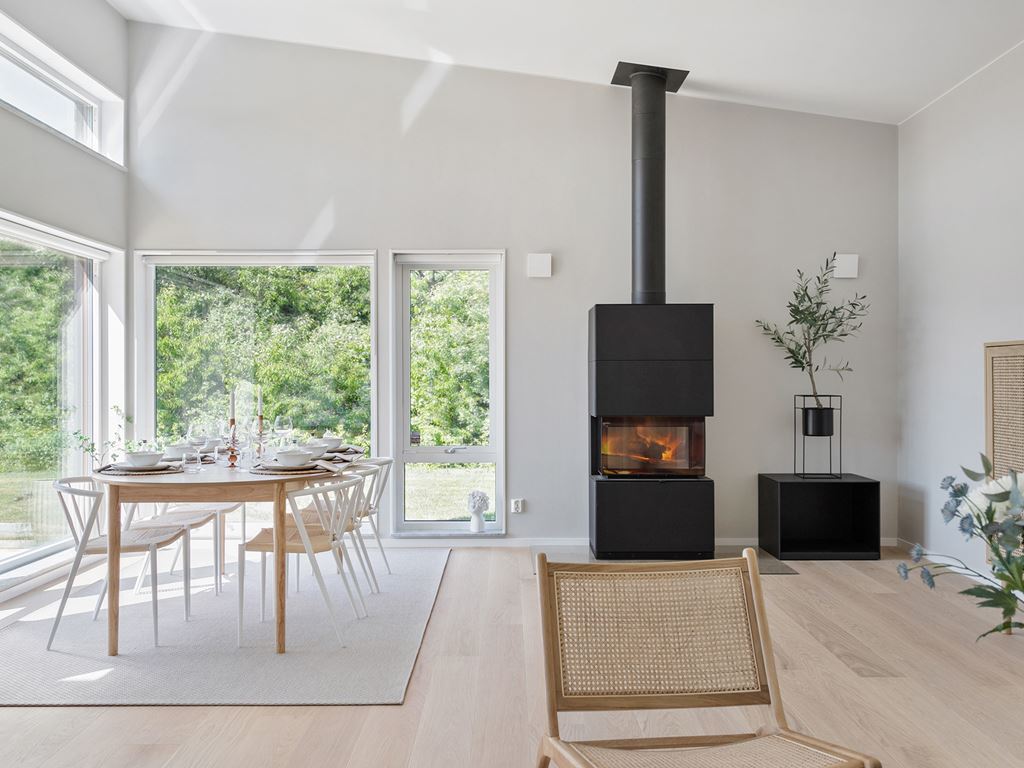 Vackra ljusinsläpp och rymd, detta tack vare den öppna vyn mot det generösa glaspartiet i vardagsrummet och rymden från öppningen i bjälklaget mot övervåningen. På så vis knyts dessa ytor naturligt samman. Kök och vardagsrum ligger avskilt från varandra, men knyts ihop via de generöst glasade ytorna i respektive rum – med siktlinjer sinsemellan för ett vackert samspel. På plan 2 finns den mer privata delen med allrum, badrum och husets fyra sovrum.