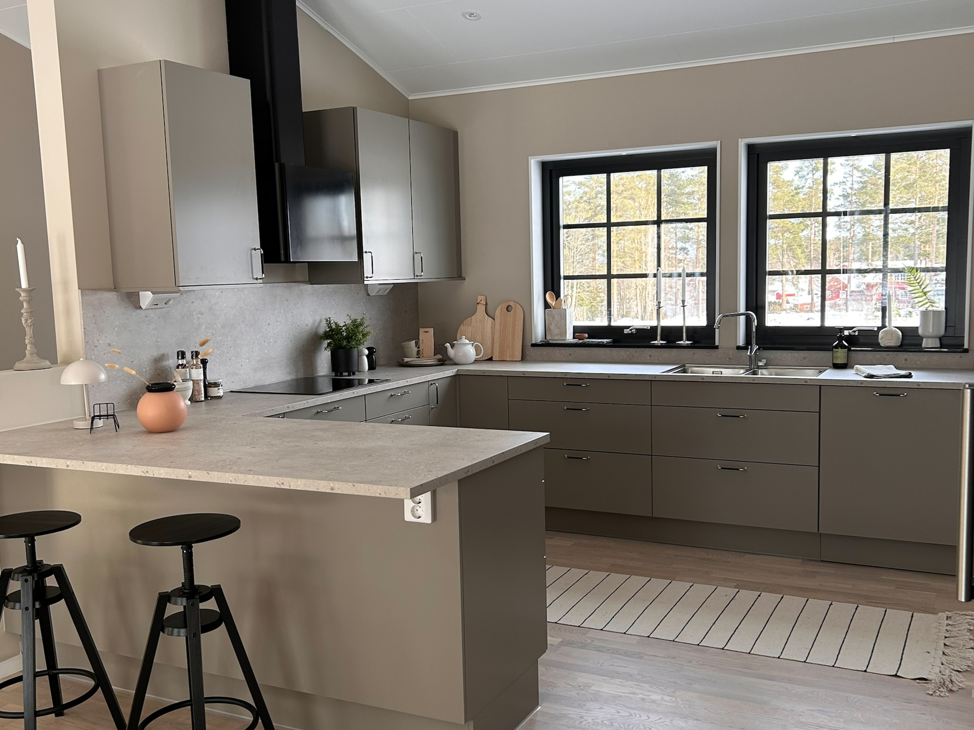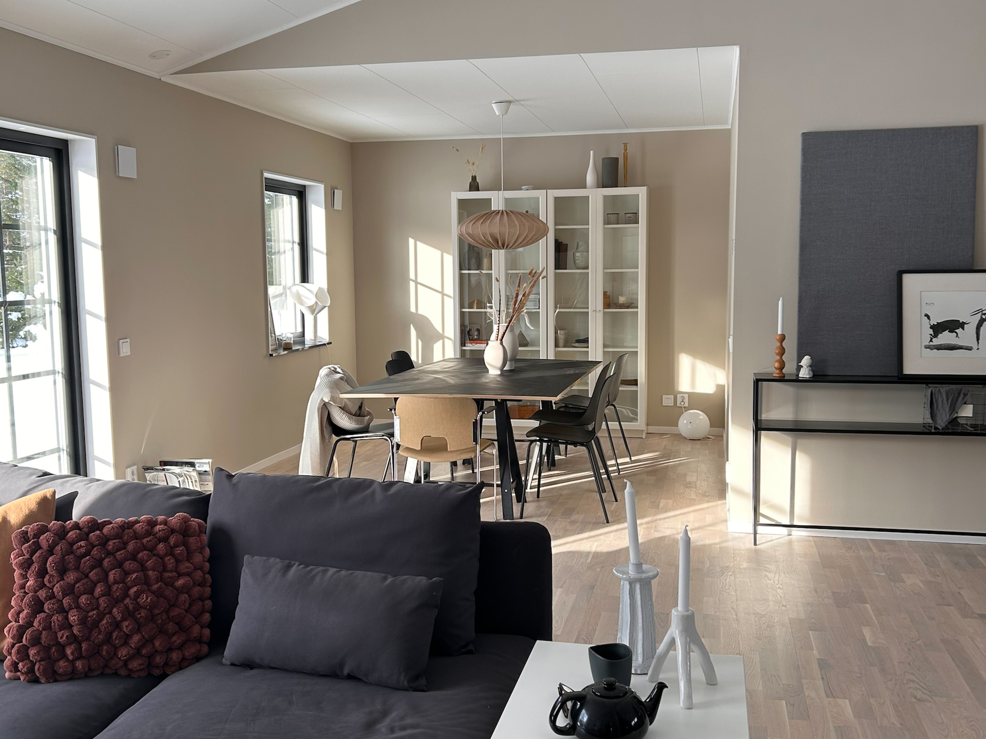 Det här huset är designat för att ge en luftig och öppen känsla, med en central umgängesdel där köket och vardagsrummet smälter samman. Den öppna bardelen skapar en social plats för både vardag och fest, och de stora fönsterpartierna ger ett fantastiskt ljusinsläpp.