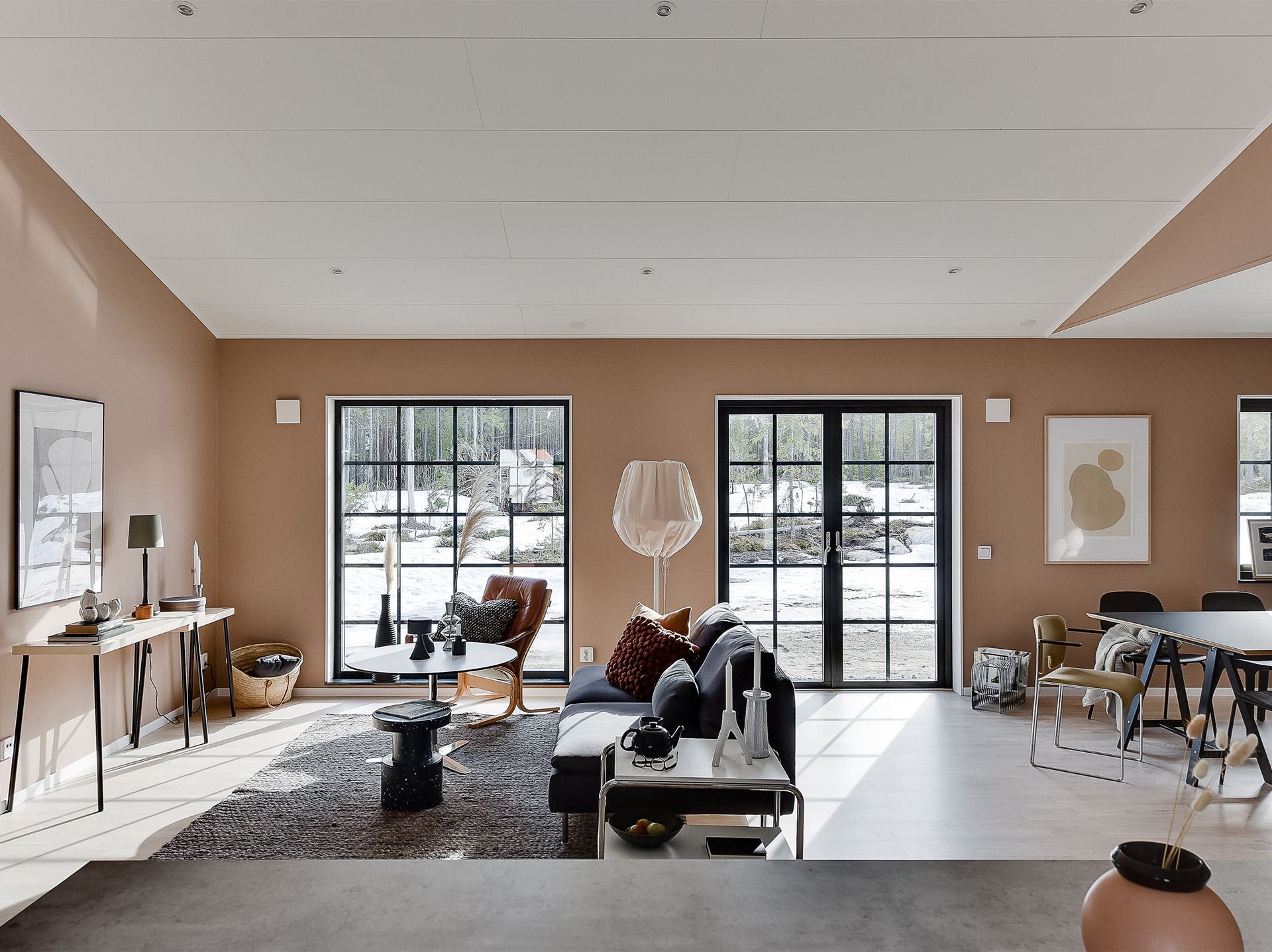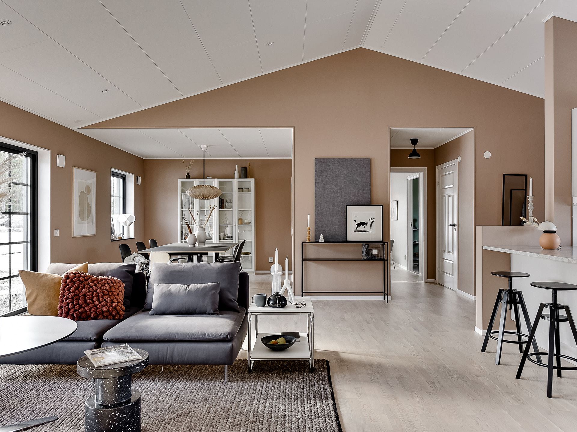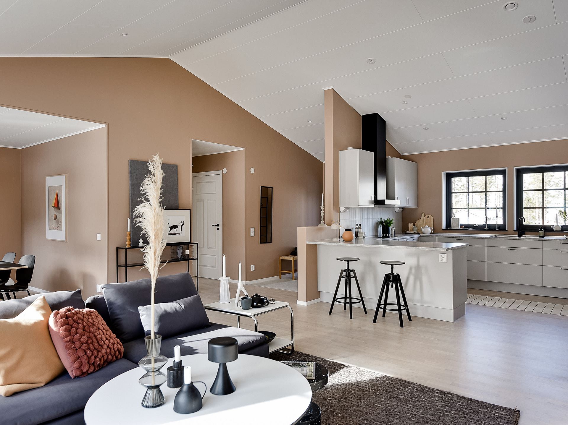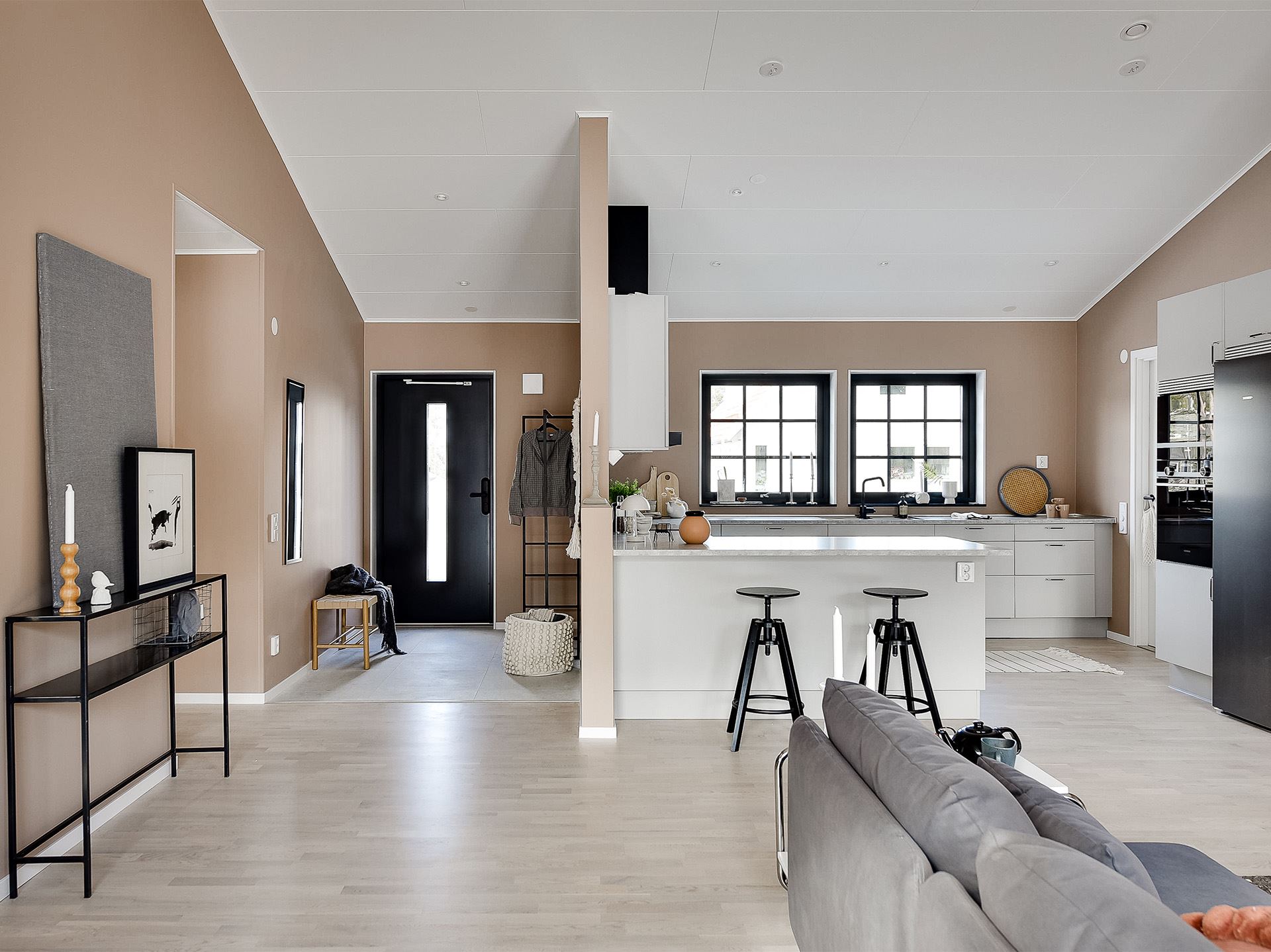 Det här huset är designat för att ge en luftig och öppen känsla, med en central umgängesdel där köket och vardagsrummet smälter samman. Den öppna bardelen skapar en social plats för både vardag och fest, och de stora fönsterpartierna ger ett fantastiskt ljusinsläpp.