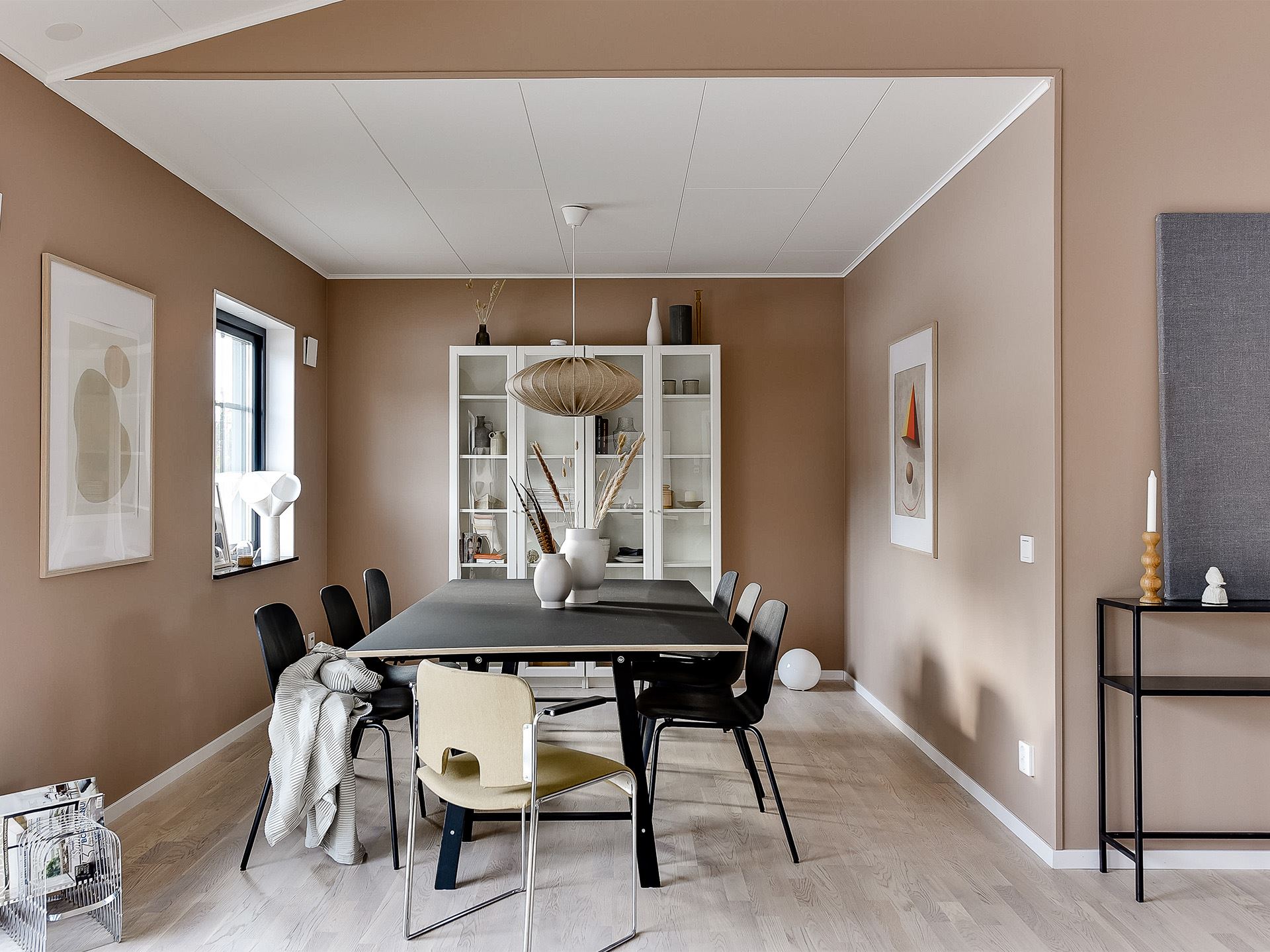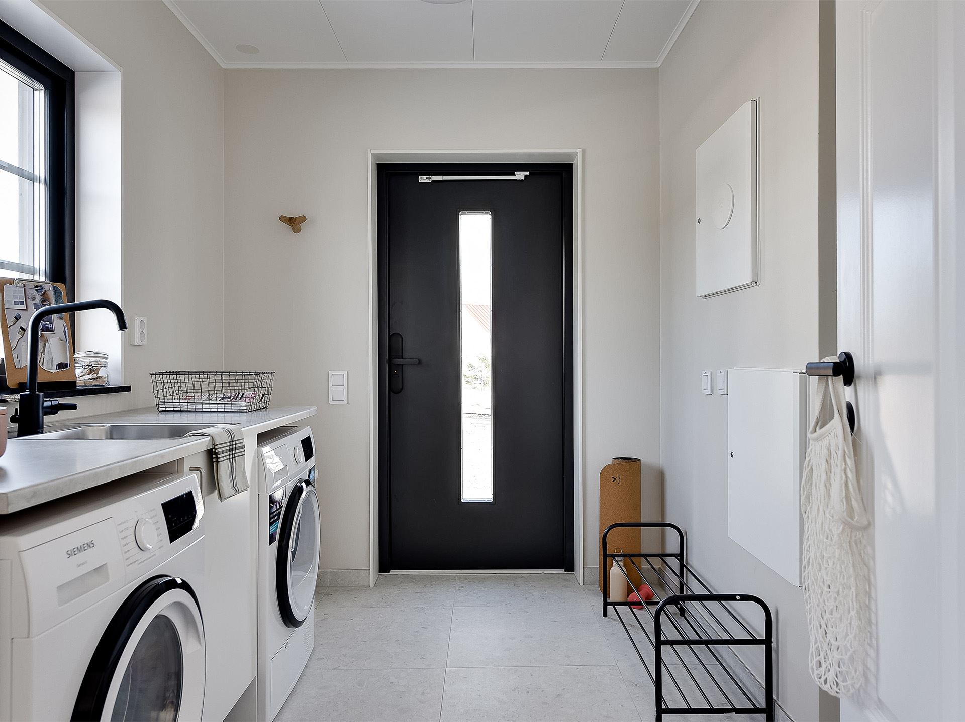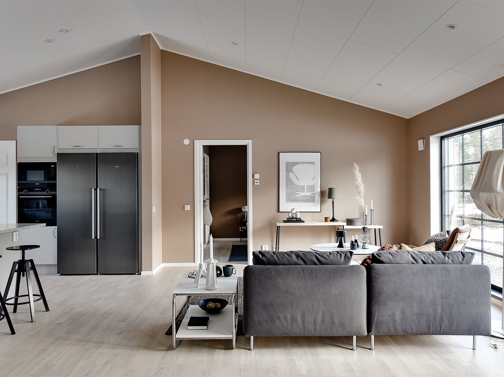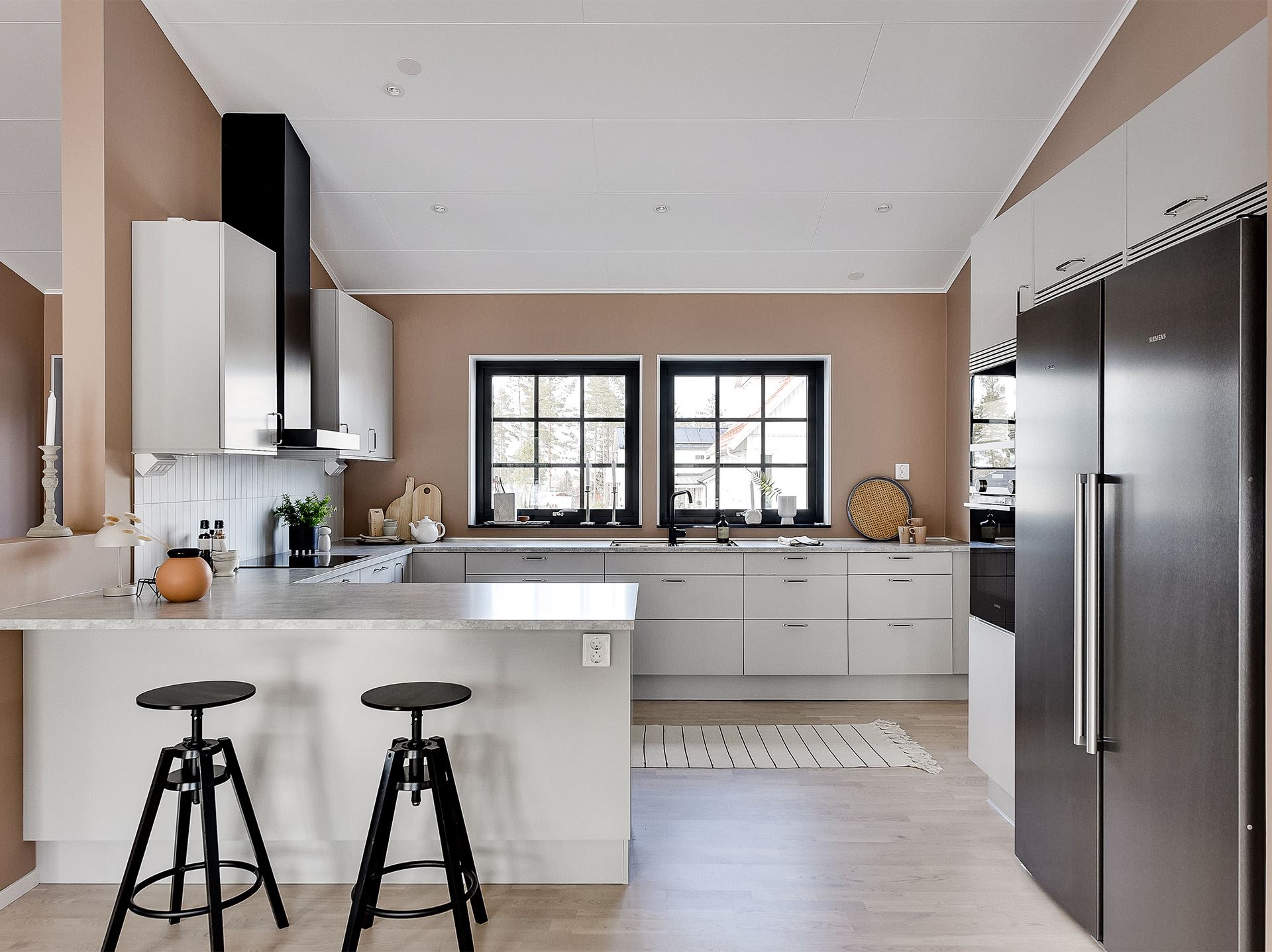 Det här huset är designat för att ge en luftig och öppen känsla, med en central umgängesdel där köket och vardagsrummet smälter samman. Den öppna bardelen skapar en social plats för både vardag och fest, och de stora fönsterpartierna ger ett fantastiskt ljusinsläpp.